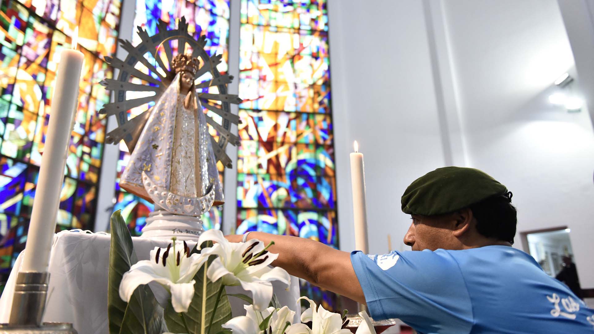 “Esta imagen ha sido mirada y contemplada por nuestros soldados. Muchos seguramente le pedían que nos ayude en esta vida y en esa guerra que estaban teniendo. Tenemos la gracia de tener a ex combatientes aquí y a otros María los ayudó al tránsito a la vida eterna”, describió Monseñor Santiago Olivera, obispo castrense de Argentina