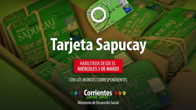 El Ministerio de Desarrollo Social del Gobierno de Corrientes, a cargo de Adán Gaya informa a los beneficiarios del Programa que las Tarjetas Sapucay estarán a disposición desde este miércoles 3 de marzo.