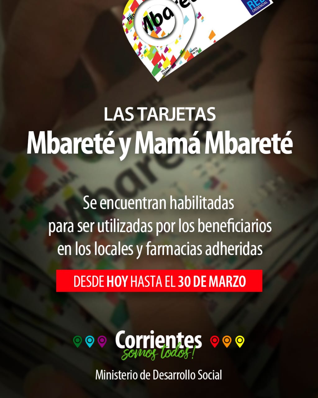 La tarjeta Mbareté permite a los beneficiarios la compra de medicamentos sin cargo en la red de farmacias adheridas, con un límite de monto autorizado de $1000. Este beneficio alcanza a las personas empadronadas que se encuentran en situación de vulnerabilidad, que no cuentan con cobertura social, y que están domiciliadas en jurisdicción de la provincia de Corrientes.