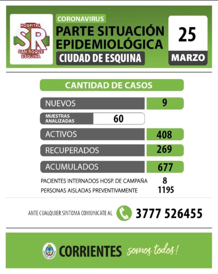 Este viernes el equipo de salud del Hospital San Roque de Esquina, a cargo del Dr. Leandro Ramórez, ealizará nuevamente testeos masivos en el Centro de Salud del Barrio San Antonio, desde las 10 de la mañana. En tanto que desde las 11 se harán hisopados en el Hospital. La localidad cuenta actualmente con 408 casos activos.