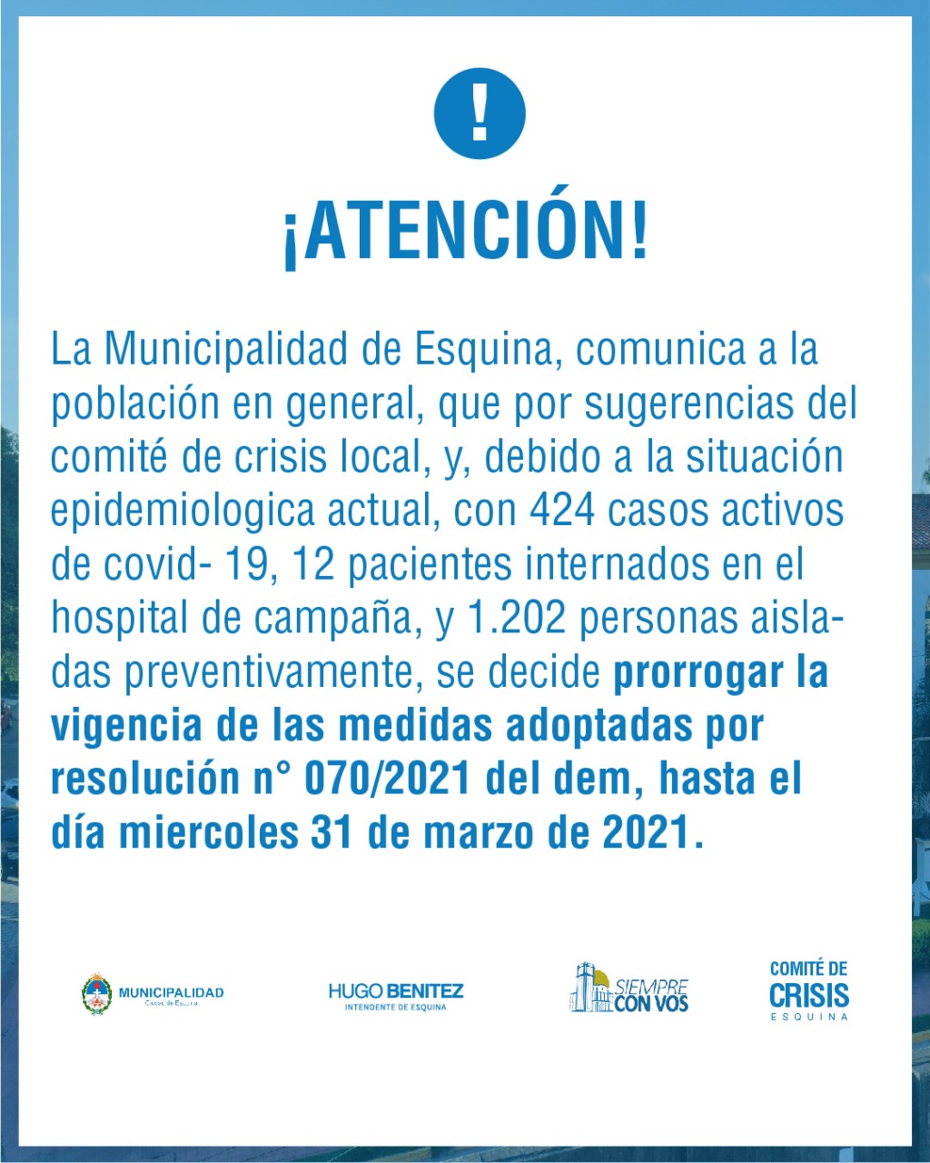 El intendente de Esquina, Hugo Daniel Benítez, habló con Comunicándonos y anticipó que las medidas restrictivas tomadas por el aumento de casos, continuarán en vigencia por 5 días más. “Las medidas continuarán hasta el 31 de marzo por recomendación de los médicos y del Comité de Crisis de Corrientes. La cantidad de casos activos no disminuyeron como esperábamos así que decidimos continuar con la misma modalidad. Creemos que para el lunes y martes vamos a dar muchas altas, que serían las primeras 200 o 250 personas contagiadas”, dijo.