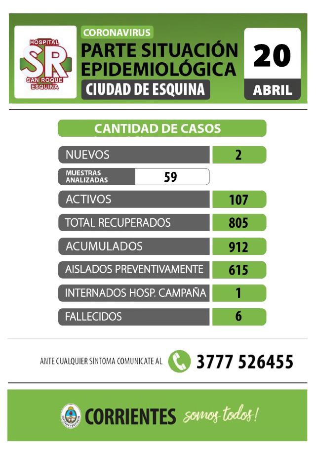 El parte oficial del Hospital San Roque, informó que en la jornada de este martes se detectaron dos nuevos casos de coronavirus. Ya son 107 casos activos de coronavirus.