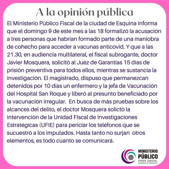 En el comunicado indica que “se formalizó la acusación a tres personas que habrían formado parte de maniobra de cohecho para acceder a vacunas anticovid”, y que “el fiscal subrogante, doctor Javier Mosquera, solicitó al Juez de Garantías 15 días de prisión para todos ellos, mientras se sustancia la investigación”.