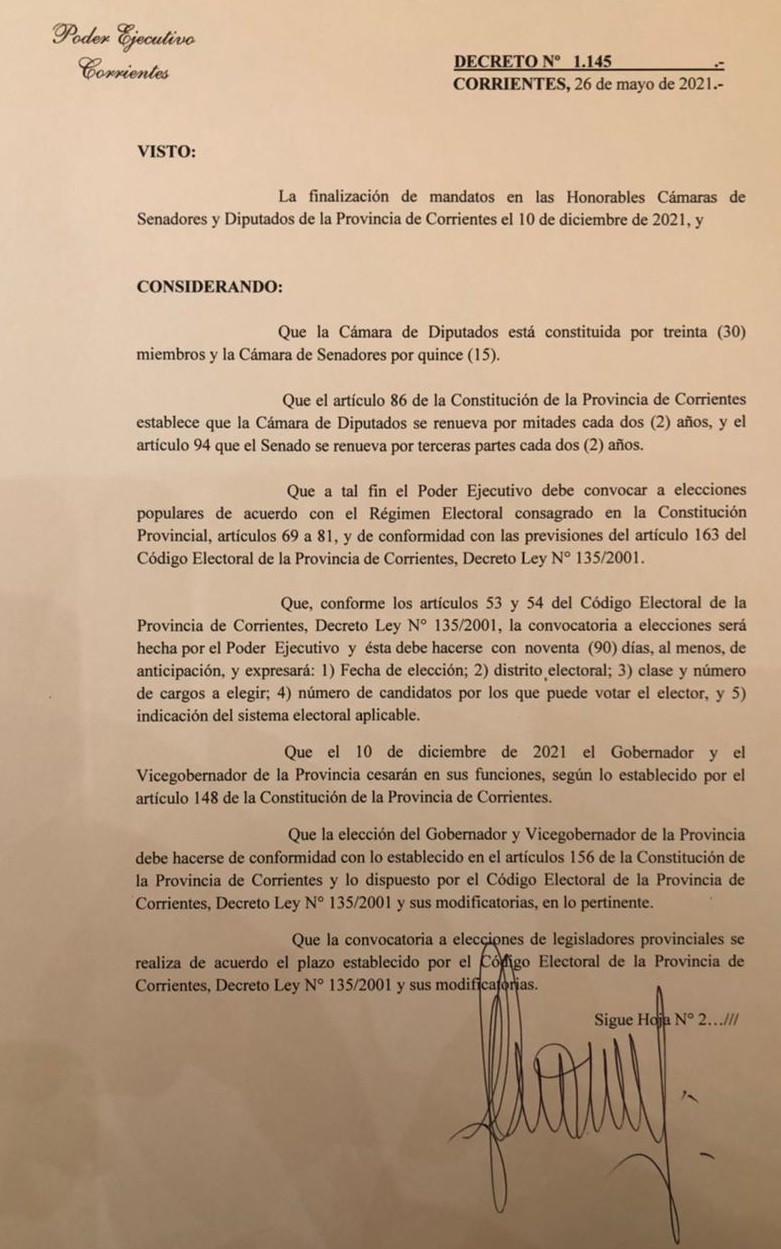 El Decreto Nº 1.145 con fecha del 26 de mayo de 2021 tiene 7 artículos y, llamativamente, el cuarto es donde se menciona la convocatoria dirimir quién será el próximo jefe del Ejecutivo provincial el próximo 29 de agosto. En el artículo primero se convoca a comicios en toda la provincia para elegir senadores y diputados provinciales que reemplazarán a quienes finalizan su mandato el 10 de diciembre.