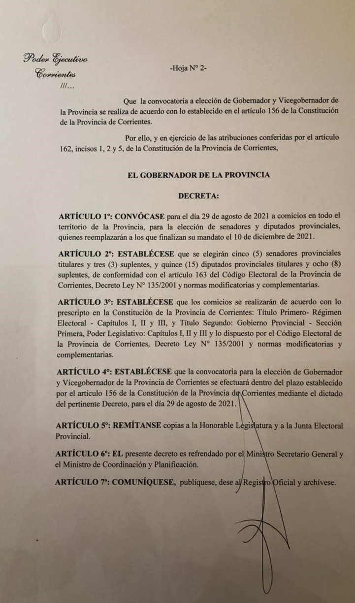 En tanto, en el artículo segundo se detalla que se elegirán cinco senadores provinciales titulares, tres suplentes; y 15 diputados provinciales, ocho suplentes, conforme a lo que dicta el artículo 163 del Código Electoral de la Provincia de Corrientes, Decreto Ley Nª 135/2001 y normas modificatorias y complementarias.