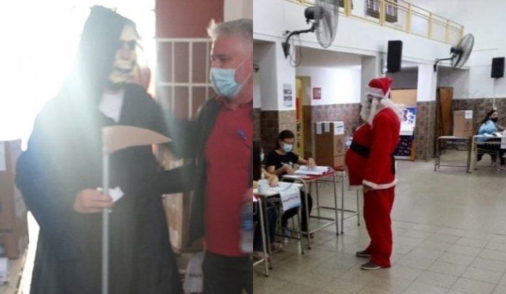 Los cordobeses tampoco se privaron de concurrir disfrazados al lugar de votación. En Villa Nueva aparecieron San La Muerte y Papá Noel, quienes se presentaron en las primeras horas de la mañana para emitir su voto en la escuela Mitre.