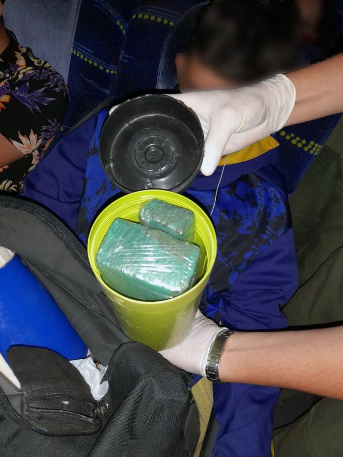 A medida que los gendarmes avanzaban solicitando los datos de los pasajeros, un ciudadano mostraba un nerviosismo atípico. Ante testigos los uniformados alumbran con sus linternas el lateral de los termolares que trasladaba el joven, observando que en el interior de los bidones térmicos no contenían líquidos sino paquetes pequeños prensados con marihuana.