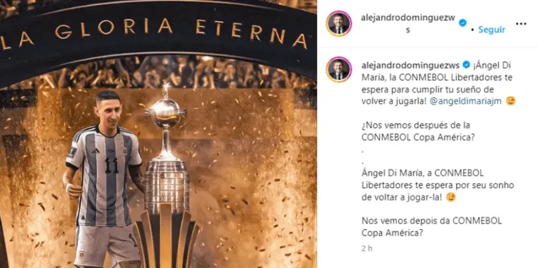 “¡Ángel Di María, la CONMEBOL Libertadores te espera para cumplir tu sueño de volver a jugarla! @angeldimariajm 😉”, publicó el máximo directivo en su cuenta de Instagram. Y remató: “¿Nos vemos después de la CONMEBOL Copa América?”.