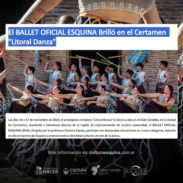 El BALLET OFICIAL ESQUINA tuvo una destacada participación en el Certamen “Litoral Danza”, donde deslumbró con sus presentaciones en nueve categorías. Con el talento de sus bailarines, el ballet local no solo dejó una huella en el escenario, sino que también destacó el arte y la cultura de la comunidad de Esquina. Durante el evento, que reunió a importantes representantes del mundo de la danza, el jurado, compuesto por reconocidos profesionales de primer nivel, otorgó su reconocimiento a la calidad y la técnica mostrada por los artistas locales.