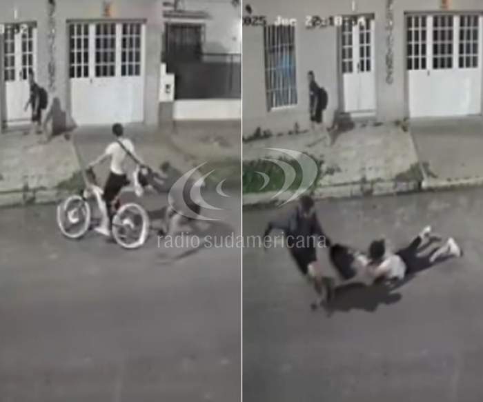 En las imágenes se observa cómo la víctima pedaleaba tranquilamente cuando un delincuente que iba como acompañante en una motocicleta se bajó abruptamente, la agarró de la mochila y la tiró al suelo, arrastrándola por la cinta asfáltica.