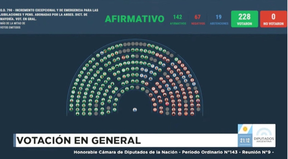 El aumento de los haberes y el bono fue aprobado con 142 votos afirmativos, 67 en contra y 19 abstenciones. Se manifestaron a favor Unión por la Patria, el Frente de Izquierda, la Coalición Cívica, Encuentro Federal, Democracia para Siempre e Independencia. Fue rechazado por LLA, el PRO y bloques provinciales. La UCR se abstuvo.