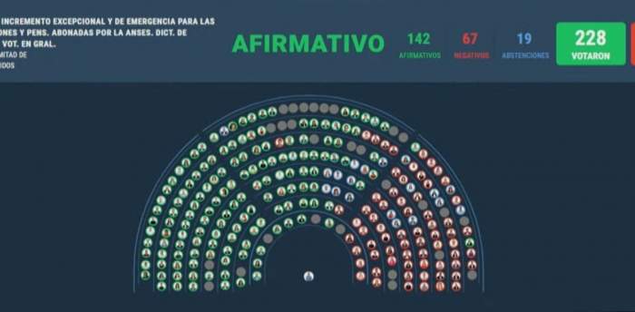 Cerca de las 21.50 de este miércoles, la Cámara de Diputados logró darle media sanción al proyecto que busca aplicar un incremento del 7,2% a las jubilaciones y llevar el bono de $70.000, que reciben los adultos mayores con haberes mínimos, a $110.000. Con 142 votos a favor, la iniciativa pasó al Senado.