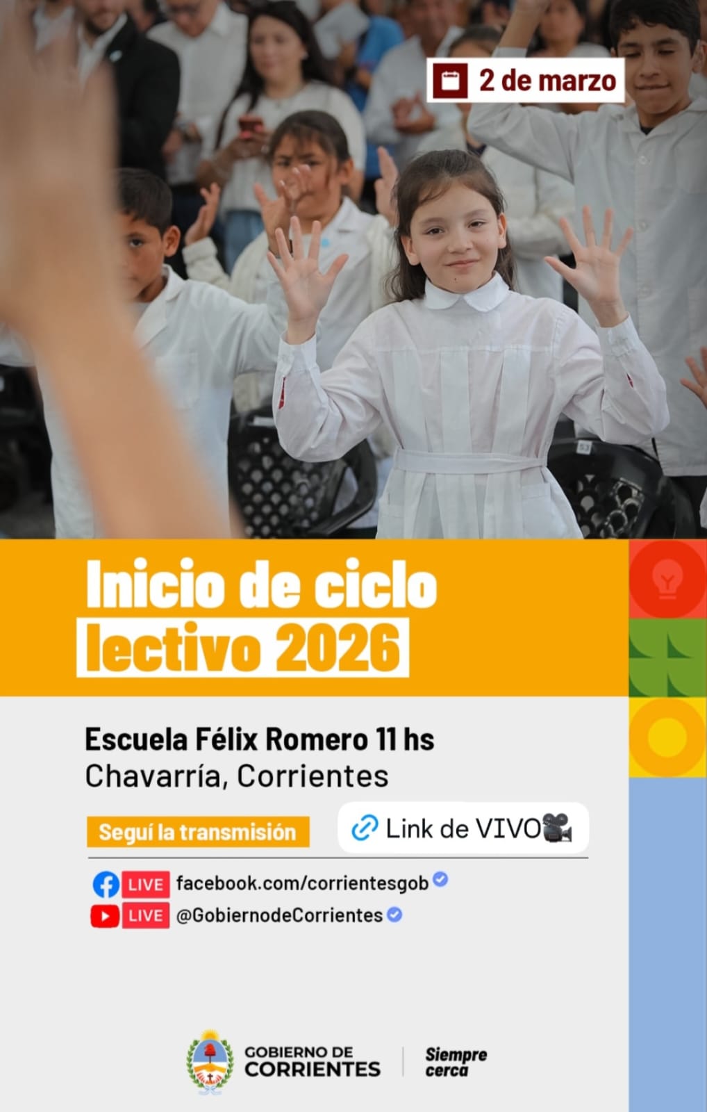 El gobernador de Corrientes, Juan Pablo Valdés dejará este lunes oficialmente habilitado el ciclo lectivo 2026 en la provincia, inaugurando a las 11 el nuevo edificio del colegio secundario “Félix María Romero” de la localidad de Chavarría, construido en la esquina de las calles Pedro Quiróz y Berón de Astrada. El acto se transmitirá en vivo a través de redes oficiales.